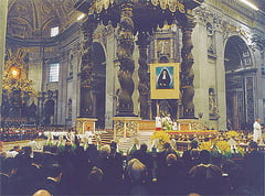 Basilika fortpflanzt, die Ankunft des Heiligen Vaters an, von viel Assistenz begleitet. Papst Johannes Paul II. steigt die Stufen zum Altar hinauf und beginnt mit dem feierlichen